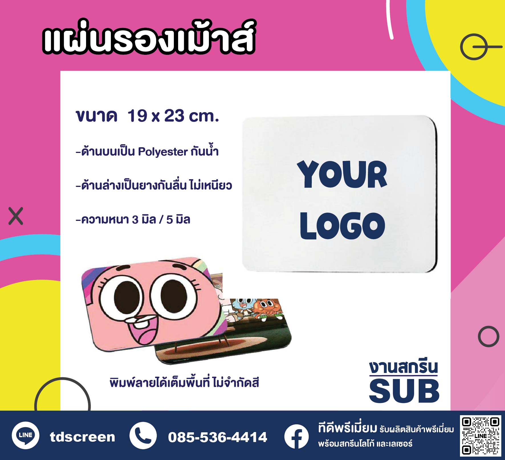 แผ่นรองเม้าส์พิมพ์รูปภาพ พิมพ์โลโก้ได้ไม่จำกัดสี ไม่มีค่าบล็อก